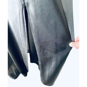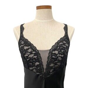 Stunning vintage 1990s or Y2K Victorias Secret black satin and lace slip dress with side slit. White and gold vintage VS label inside. Sexy and clingy bias cut poly satin hugs your body and the side slit goes to the hip/thigh area. Sheer lace cups, lace straps. Straps are adjustable in back.