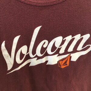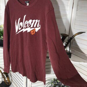 Vintage Y2K Volcom long sleeve shirt with a white logo on a dark wine-colored cotton background. Size Large.