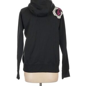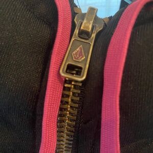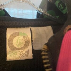 This hoodie is composed of Volcom’s V Line Science technical material. It is thick and water resistant on the outside. The interior is fleece. The date of production is likely late ‘90s / y2k.