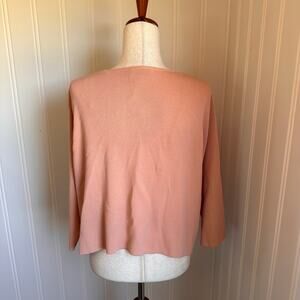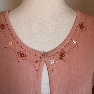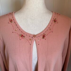 This vintage Y2K volup Studio I Women's Petite is a size 18. This orange cardigan has a beaded floral pattern around the collar and 3/4 sleeves. It has one button on the chest, is a viscose/nylon and hand wash. This cardigan has cottagecore vibes and is in good vintage condition.