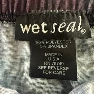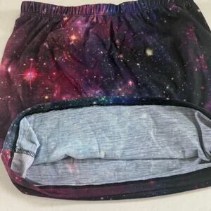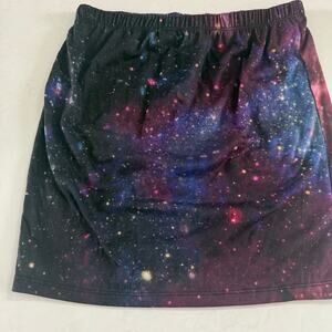 Wet Seal womens mini skirt in a vibrant galaxy print with purple, pink, and blue tones. Features a soft stretch fabric and elastic waistband for a comfortable fit. Black base with cosmic stars throughout. Size S (waist 15.5" flat, length 15"), best for juniors or modern XS/S.