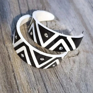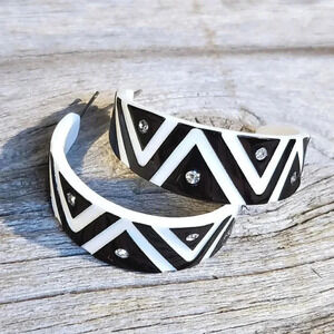 Vintage Y2K White Black Lucite Austrian Crystal Zig Zag Triangle Hoop Earrings