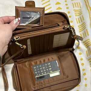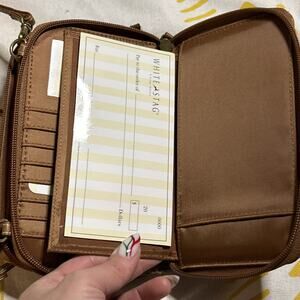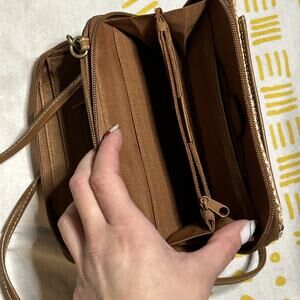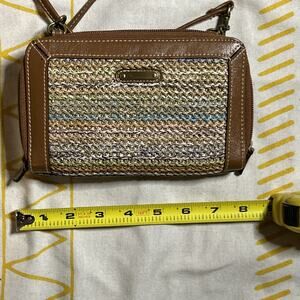 small, multicolour woven straw crossbody purse with brown faux leather trim, has original packaging inside and looks unused apx. 4” by 8”