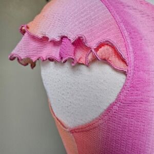 Keywords: ombre top, ruched top, v neck, cap sleeve, lettuce hem, slub knit, pink orange, womens top, casual, summery, girly, Y2K, lizzie mcguire