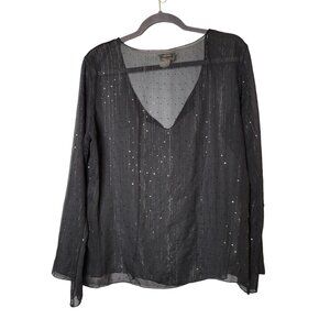 tags/keywords: sheer blouse, plus size top, long sleeve blouse, black sheer top, women's fashion, elegant top, polyester blouse, USA made, 1XL blouse, Check It Out Plus, sparkly blouse, women's clothing, black blouse, whimsigoth, witchy, grunge, vintage