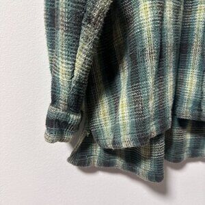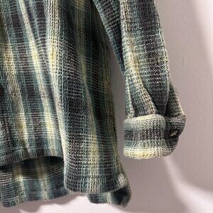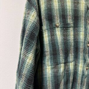 Vintage 90s/Y2K green plaid flannel button down shirt. The texture is similar to a waffle knit. Relaxed, oversized fit. Collared neckline, roll tab sleeves, two chest pockets with button closures.