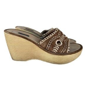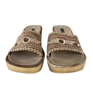 Y2K Xhilaration Leather Wedge Slide Sandal. Women’s size 8. Brown leather with circle cutouts, decorative embroidery and whip stitch edges. Wedge heel with small platform. Very cute and total Y2K style. These look amazing with long skirts and flare jeans.