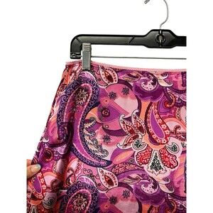 Embrace a touch of whimsical grunge with this Vintage Y2K Xhilaration Paisley Satin Midi Skirt. The skirt boasts a vibrant pink, purple, orange paisley pattern with an eye-catching beaded trim that adds a unique flair to the classic A-line silhouette.