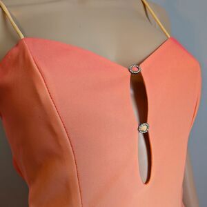 Vintage early 2000s (Y2K) Zum Zum by Nikki Livas orange and yellow ombre prom gown. Maxi length dress. Sleeveless, spaghetti straps. Rhinestone detailing at bust with cutouts. Open strappy back. Lined. Dress is in good vintage condition with two small runs at front and small areas of staining on back hem. Please see photos.