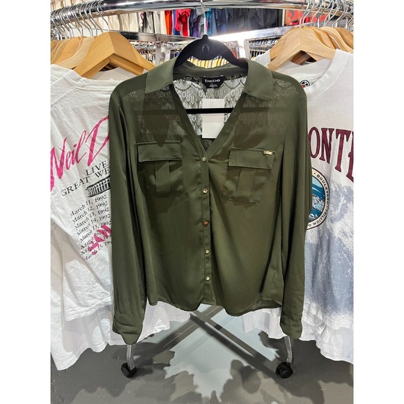 Vintage Y2K bebe Army Green Lace Back Button Down Blouse Size Medium