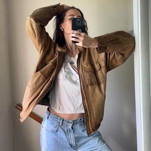 Vintage brown leather bomber jacket. Cargo pockets on an awesome faded tan light brown bomber. Slouchy baggy fit, pretty pale green lining. Has normal light vintage wear, including inch-long tears on inside shoulder seams where shoulder pads were removed/shouldn't effect wear/selling as-is.