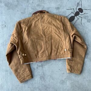 Vintage Y2K cropped Carhartt Detroit style work wear jacket. Cut from coveralls so the zipper does not work!!! Couple marks nothing crucial. Measures 24.5x20.5. Please check measurements before purchasing. I do my best to show any flaws in pictures. Quick shipping! Bundles encouraged!