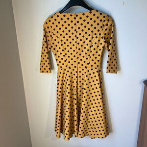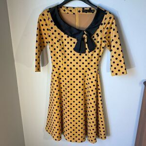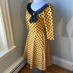 Vintage Y2K does 1950’s! This fit and flare dress with scoop neck and bow has such cool vibes!! So flattering, heavy thick fabric. Hidden zipper, cropped sleeves, flare mini has volume! Super slimming with flattering darts. Very little stretch please see measurements. Lined, 100% poly. So comfortable! Mustard yellow with black polka dots- on trend for Spring ‘23! No one will have this at your #prom #weddingguest #kentuckyderby. formal party!! Flat lay 36” L, W 13”, 16” P-P. Excellent condition. Gorgeous Marigold