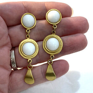 Vintage Y2K pierced earrings - brushed goldtone & white beads in a mod drop & dangle style. No hallmarks but these are nice quality costume jewelry. In excellent vintage condition - light wear - no damage or flaws.