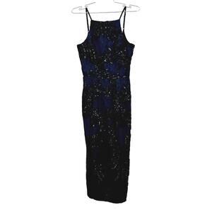 Vintage Y2K sequin dress. By Dress the Population. Made in the USA. Size XS. Approximately 15” pit to pit and 40.5” in length. Vibrant blue with black lace and sequin overlay. Adjustable straps. Approximately 24” at waist.