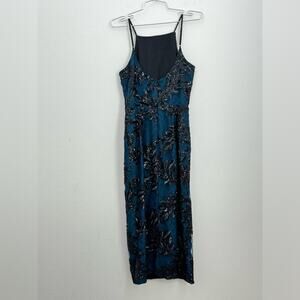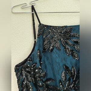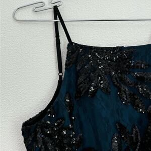 Vintage Y2K sequin dress. By Dress the Population. Made in the USA. Size XS. Approximately 15” pit to pit and 40.5” in length. Vibrant blue with black lace and sequin overlay. Adjustable straps. Approximately 24” at waist.