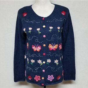 Beautifully unique 2001 vintage blue knit crochet and embroidered butterfly and floral cardigan by Tiara International.