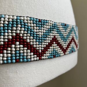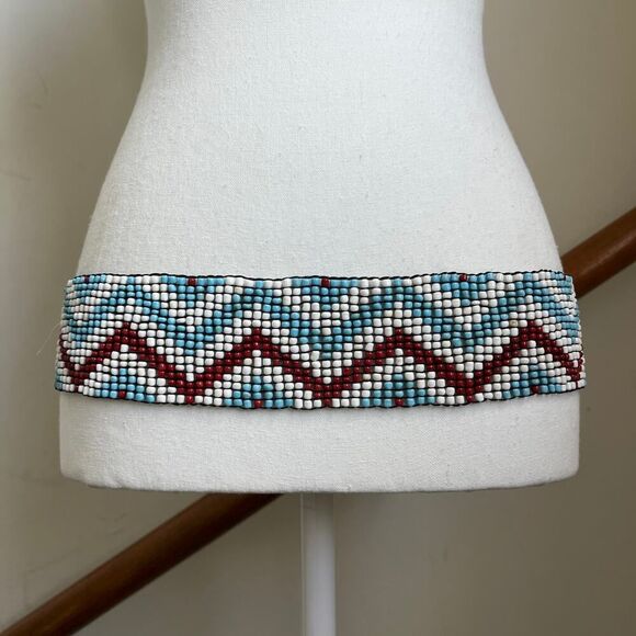 Stretchy boho belt, blue white red, good quality. Fits small-large because it's stretchy / no closure - pulls on over head. Love that it can be worn as a necklace too.