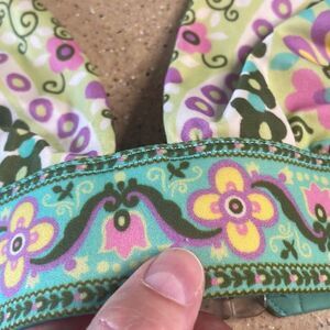 Vintage Y2K (2005) Victoria's Secret boho print bikini top. Fun boho floral print in shades of aqua, pink, lilac, olive green, cream, yellow. Features lined unpadded top - there aren't any openings to place pads, thick band strap with clear plastic closure, tie around neck. Gently worn and laundered with only flaw being some tiny snags on front band (see last pic). This is true Y2K and would be perfect to wear as a top underneath something sheer or to a festival with jean shorts!