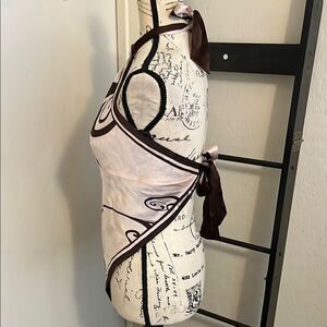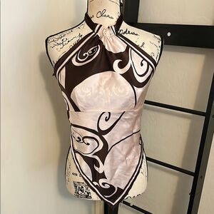 Vintage Y2K Bebe Silk Blend Multi Color Print Reversible Halter Handkerchief Tie Top, size medium.
