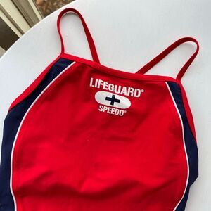 ’90s/Y2K sporty chic vintage Speedo Lifeguard one-piece swimsuit! This high-performance suit features a bold red and navy color-blocked design with white piping, strappy crisscross back, and high-cut leg for that iconic Baywatch-meets-competitive-swim look. The Speedo Lifeguard logo adds a retro flair. Constructed from Speedo’s signature durable nylon/Lycra blend, ensuring a sleek, sculpted fit. Whether you’re swim training, rocking it at the pool, styling it as a trendy bodysuit, or collecting authentic vintage athleticwear, this Speedo swimsuit is a true throwback essential.