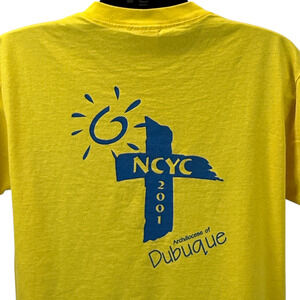 Vintage Y2Ks NYCY Archdiocese of Dubuque 2001 T Shirt Catholic Christian Jesus Christ Iowa Religion Religious Yellow L Large Fruit of the Loom Made In USA Graphic Tee
