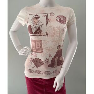 Vintage Y2k Asian Art Print Fitted Tee Cream Burgundy Unique Graphic Top size M by Smart Set