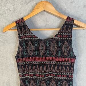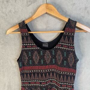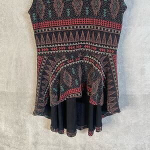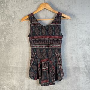 Unique sleeveless top featuring an eye-catching geometric Aztec-inspired print. This stylish top boasts a flattering peplum silhouette that accentuates the waist, and a high-low hem adds a modern touch. The top's playful pattern and comfortable fit make it a versatile choice for various occasions. The design is perfect for adding a pop of color and visual interest to any ensemble. Ideal for casual outings, parties, or even dressed up for a more elevated look.