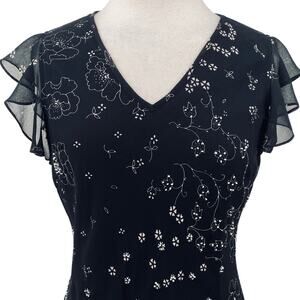 Vintage Y2k Beaded Floral Bias Cut Midi Dress Flutter Sleeve Fairy Black Medium