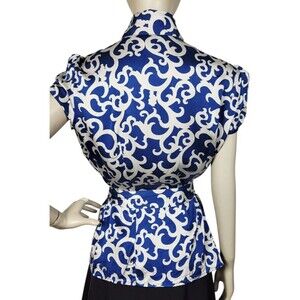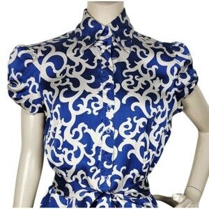keywords: vintage, 90s, Y2K, silk, scroll, baroque, spellout, logo, designer, silky, silver, cobalt, belted, rare, hard to find, feminine, sexy, business, office, church, ruched, puff sleeves, statement sleeves,