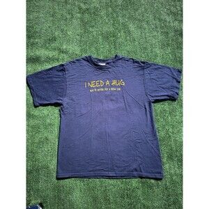 This Vintage Y2k Blue "I need a hug but I'll settle for a bl*wjob" Funny Shirt in size Large is a graphic print t-shirt with short sleeves. Made of knit fabric in the United States, this machine washable shirt features a regular fit and is perfect for all seasons. With a quirky and humorous theme, this Fruit Of The Loom branded shirt is a unique addition to any man's wardrobe.