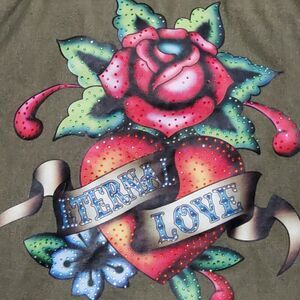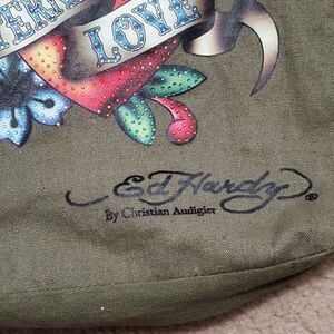 Vintage Y2k Ed Hardy Tote Bag Grunge Military Green Eternal Love Shoulder Flower. Inside zip pocket. Condition is Pre-owned. Some stains 13"x11"x3"