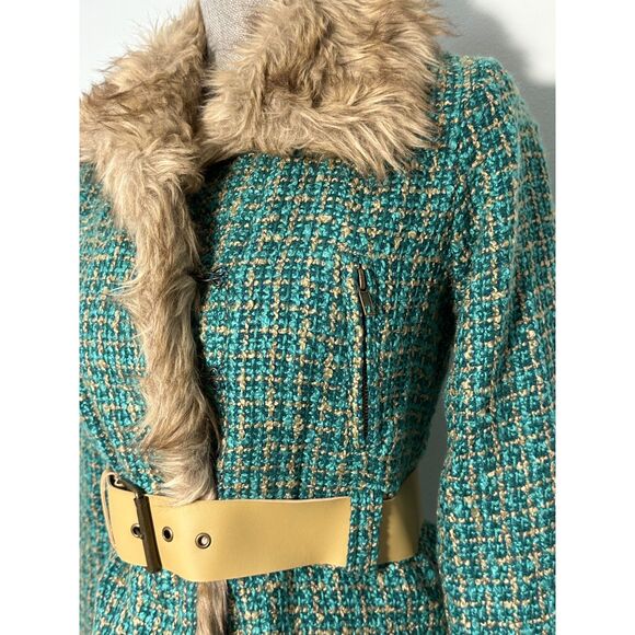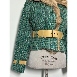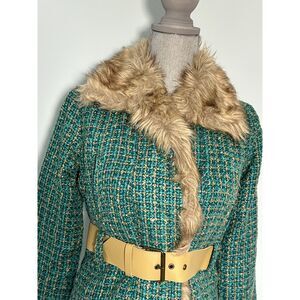 Vintage Y2k Faux Fur Belted Blue Green Gold Tweed Jacket Blazer size S