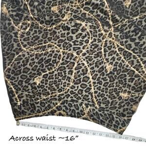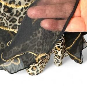 Vintage item. Classic rope design woven throughout a sheer black silk chiffon overlay with a cotton Cheetah/Leopard print beneath. Lightweight and airy with a lettuce hemline. Flare silhouette. Below knee length. Feminine and flowy with 90s Y2k boho vibes. Silkland, Tag Size 10.