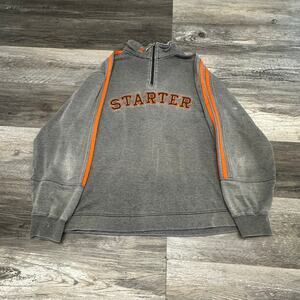 Vintage Y2k Starter Gray & Orange Mens M 1/4 Zip Long Sleeve Striped Sweatshirt, please note some stain, heavyweight knit fabric Polyester/Cotton, stand-up collar 1/4 zip up closure, classic long sleeves, pullover style, embroidered spell-out pattern, 4-lines striped pattern Casual classic activewear