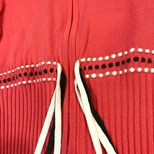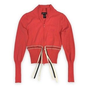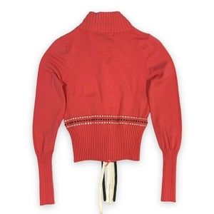 Pink sporty mock neck sweater with fabric ribbon around the waist, runs fitted and cropped. Estimated from the early 2000s.