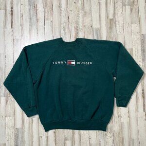 Vintage Y2k Tommy Hilfiger Forest Green Box Logo Crewneck Sweater Womens Size XL