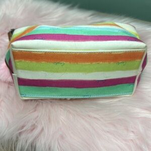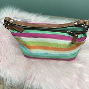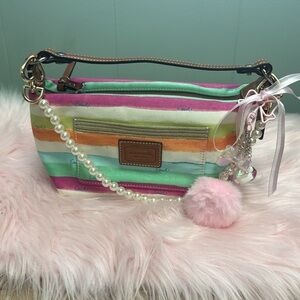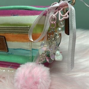 Colorful Coach clutch with bold stripes. Features pearl and charm details. Ideal for a chic look.