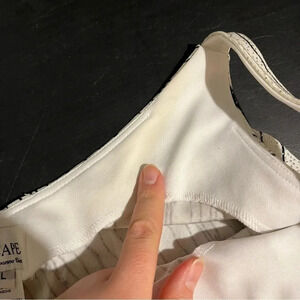 Gently used, some mild yellowing on the inside of the neckline.