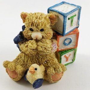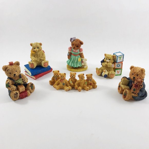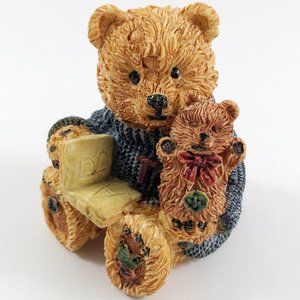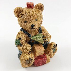 These resin bears are vintage figurines made during the late 1980s-early 1990s. They're perfect for a country-themed nursery, with a patchwork rustic daddy bear, child and baby bears, ABC books, toys, and blocks. The resin construction makes them sturdy and solid, unlike fragile glass figurines, and they can stand up to some handling. The figurines are about 3"x3" as shown. They're in excellent condition for their age with no signs of wear or damage.