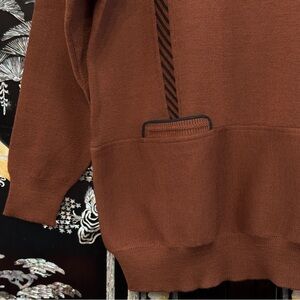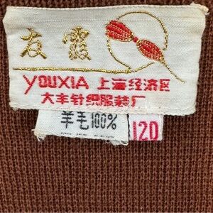 One-of-a-kind vintage YOUXIA 100% wool sweater featuring a rich brown knit with black diagonal trim and a unique mini pocket design. True vintage character — even has that authentic wool scent collectors know and love!