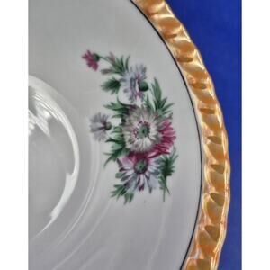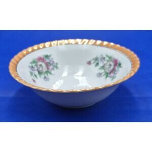 This is a vintage Yamatsu porcelain bowl from Japan. The bowl features a floral pattern of purple violets on a white background with a glossy Peach luster finish. It has a round shape with a ruffled rim and measures 7 inches in diameter and 2.5 inches in height. The bowl is an original vintage piece from the mid-century modern era and has a printed backstamp. It is a decorative serveware item that is perfect for adding a touch of elegance to any table setting.