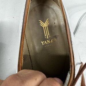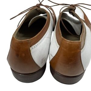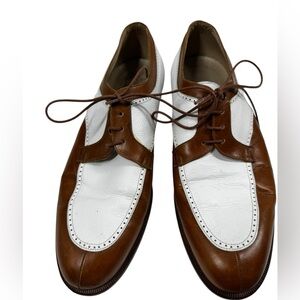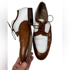 Great pair of vintage Yanka leather shoes. Lace up oxfords in white and brown leather. In great preowned condition. Size is men’s 9.