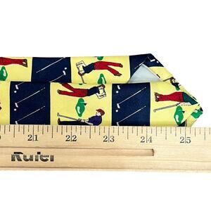 Perfect for dads or grandfathers who love golf and wear ties! Yellow background with golfers putting and swinging alternating with navy blue and repeating golf clubs. Very small discolorations as pictured. 100% polyester. Daniel Adam is the maker.