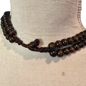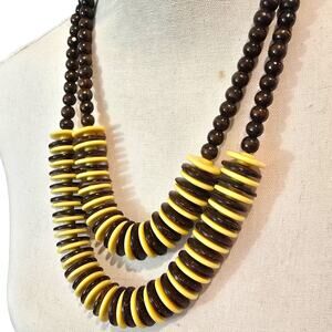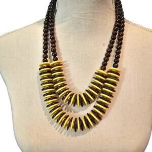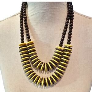 Vintage Yellow Brown Wood Bead Disc Necklace Chunky Layered Boho Statement 23in