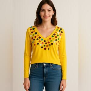 Make a colorful, creative statement with this vibrant vintage yellow long sleeve top featuring a playful V-neckline adorned with dozens of multicolored buttons in various sizes. Originally part of a boutique two-piece set (this listing is for the top only). Made from soft 100% cotton and labeled “Sandro” (not affiliated with the French designer brand), this piece was made in Hong Kong and likely dates from the late 1970s to early 1990s. A boutique-style handwritten price tag originally listed it at $185, suggesting it was a one-of-a-kind or high-quality boutique item. • Label: Sandro (vintage boutique tag) • Fabric: 100% Cotton • Made in: Hong Kong • Color: yellow with multicolor button embellishments • Era: Estimated late 1970s to early 1990s • Fit: Likely best for a Women’s Medium Condition: • A few buttons have light red color transfer around them (faint reddish rings, likely from the dye). • There are a couple of small marks on the front and upper back that appear superficial and should come out with washing. • No holes, rips, or structural flaws. Overall great vintage condition with expected character and charm. Style Tip: Perfect for fans of quirky, artsy fashion. Pairs well with jeans, overalls, or a denim skirt for a creative, throwback look.
