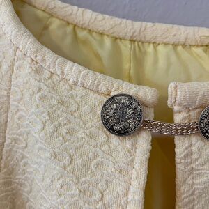 Chic vintage yellow cape featuring a stylish button closure. No tags, possibly handmade. Interior of cape is underlined and seams are finished, includes two small interior pockets. Color is a dark butter yellow, and the material is a jaquard with a bow pattern.