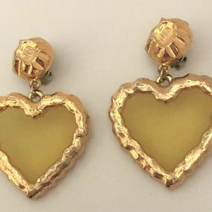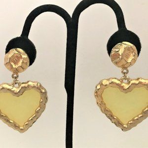 Vintage Yellow Clear Acrylic & Gold Plated Heart Dangling Clip On Earrings