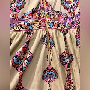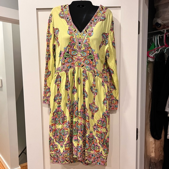 This is a vintage dress by Miss Magnin. Very colorful with the background color as yellow. The dress has a back zipper. The material has some stretch and can easily fit sizes 8/10.