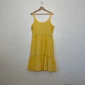 yellow eyelet dress, vintage midi dress, cotton sundress, boho tiered dress, cottagecore outfit, sleeveless summer dress, romantic yellow dress, beach vacation dress, picnic midi dress, retro eyelet dress